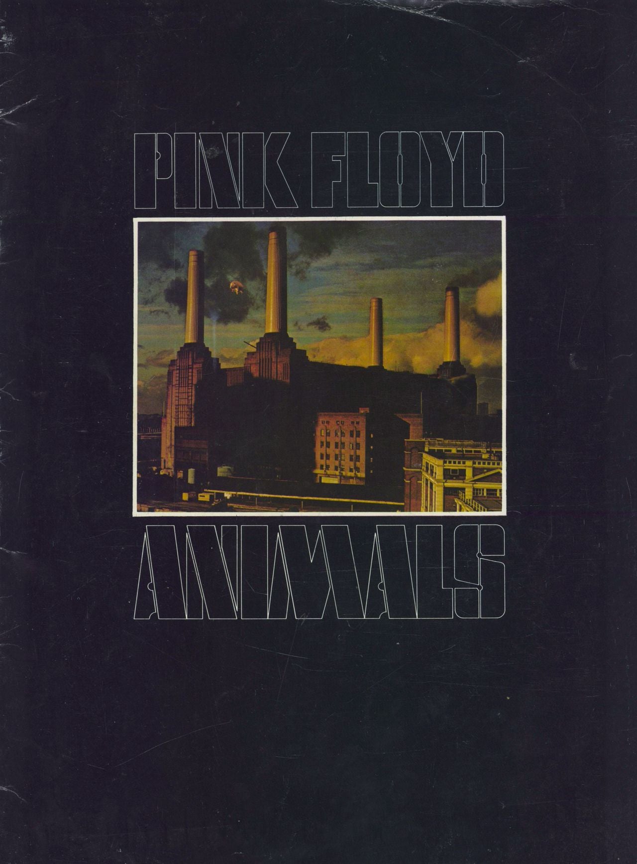 PINK FLOYD Animals (1978 UK 28-page 13" x 10" colour tour programme featuring live photographs of the band and surreal images of Battersea power station which is also featured on the front and back covers. This copy has some light crease marks, obvious disolouration to the back, but otherwise remains in decent condition with just a little wear. Also included is a stub from the gig at the New Bingley Hall, Stafford on 31st March 1977. A very acceptable VG copy at an advantageous price! )