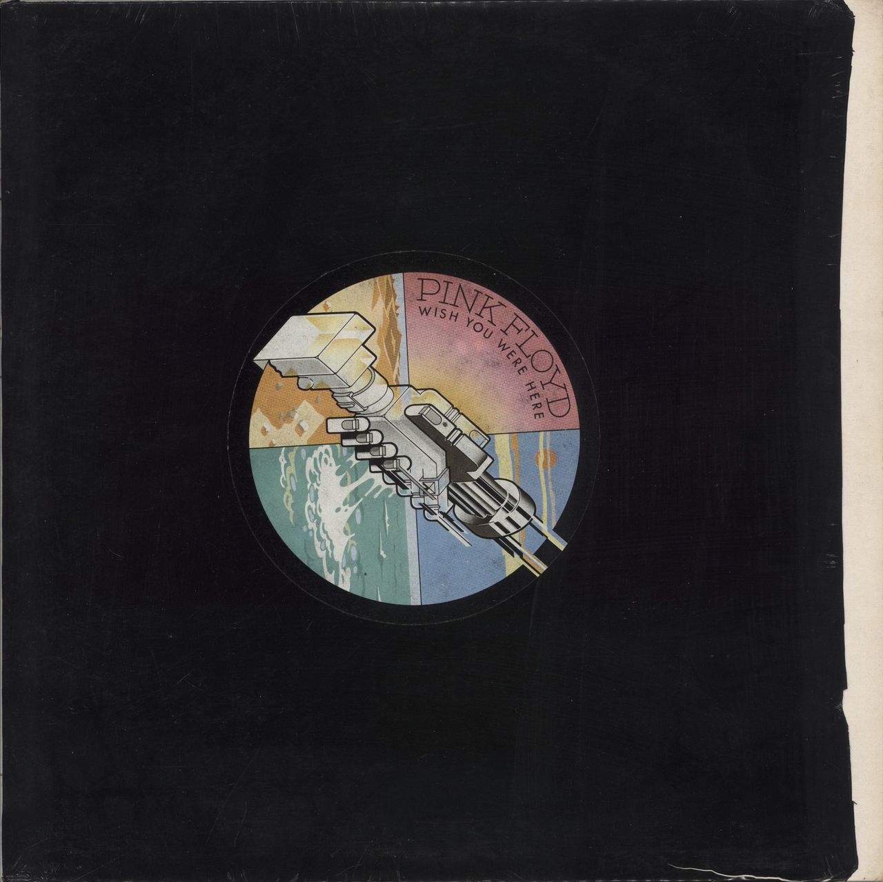 PINK FLOYD Wish You Were Here (Rare 1975 UK first issue 5-track vinyl LP with 'EMI Records Ltd' perimeter text on the labels & 'Waters-Gilmour-Wright' label credit for Part 5, indicating a first press, complete with the heavy card lyric innerwith cropped corners [later issues had rounded corners], glossy postcard with pinked edges & pinched spine picture sleeve, still with the original opened black shrinkwrap with the custom circular sticker attached on the front SHVL814)