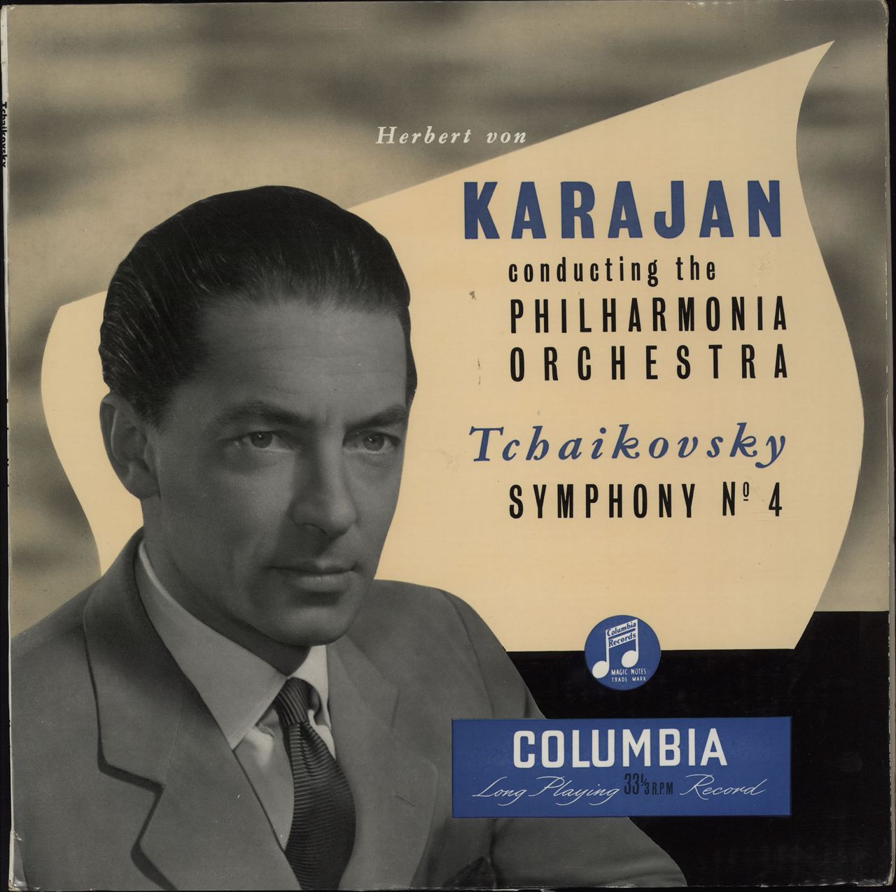 TCHAIKOVSKY Symphony No. 4 (1954 UK 4-track mono LP on the dark blue & gold Columbia label, with Herbert von Karajan conducting the Philharmonia Orchestra, fully laminated picture sleeve with scalloped flipbacks. The sleeve shows light wear and the vinyl appears Near Mint 33CX1139)