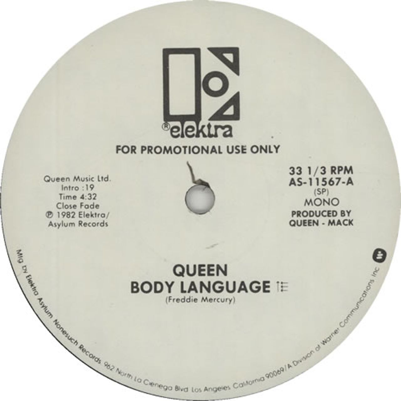 QUEEN Body Language (1982 US promotional only vinyl 12" which plays the 4:32s Version [with a 19sec intro] on both sides, with one side in stereo and the other mono. Custom white with black text labels, within a die-cut company sleeve AS-11567-A)