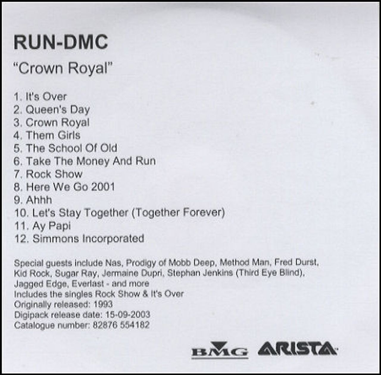 RUN DMC Crown Royal (Official 2003 UK BMG Arista label 12-track promotional only CD-R acetate for the seventh studio album with featured artists including Fred Durst, Stephan Jenkins, Sugar Ray, Everlast, Kid Rock, Nas, Prodigy and Method Man. Custom printed disc complete with a custom studio title/tracklisting inlay)