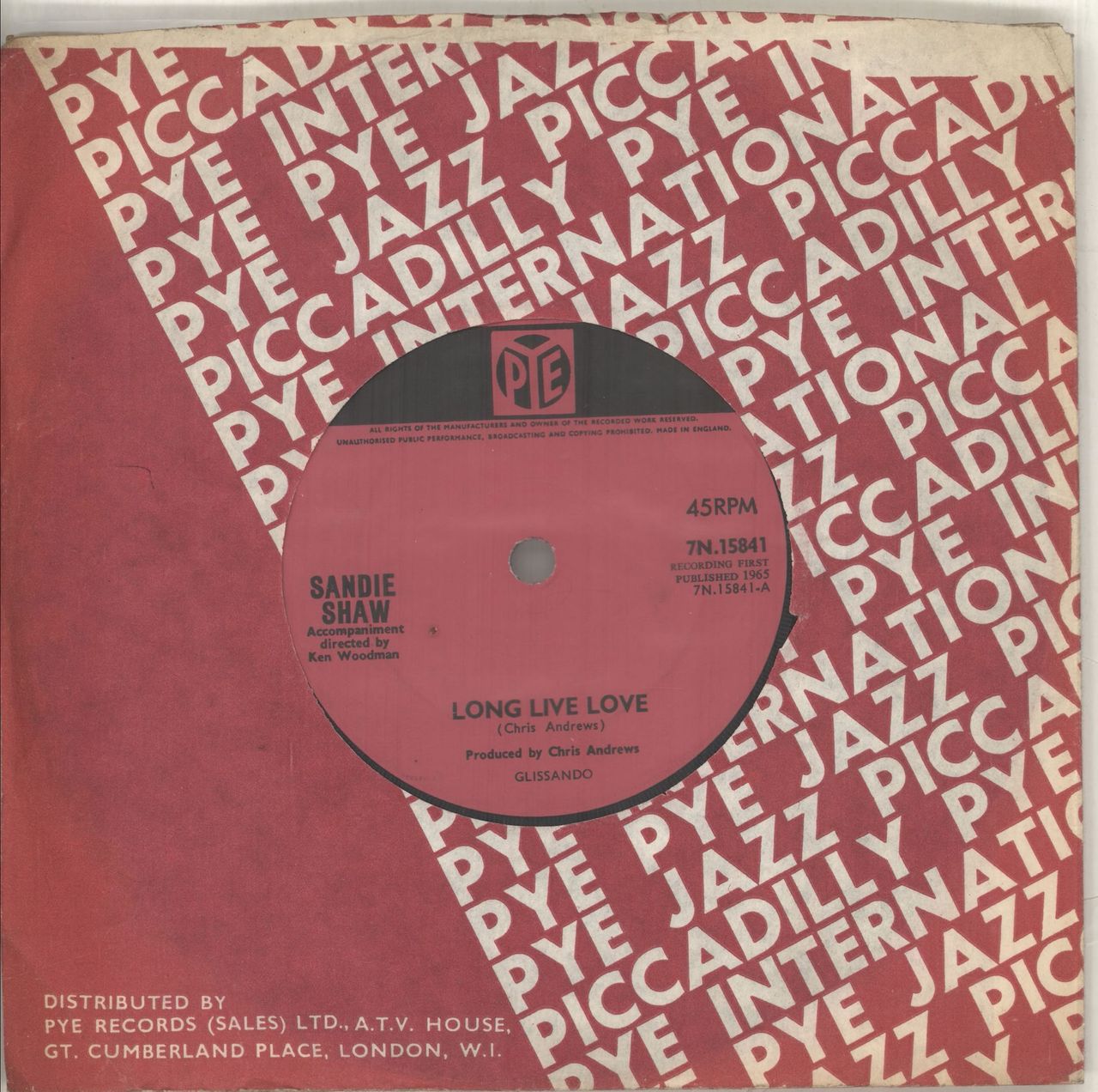 SANDIE SHAW Long Live Love (1965 UK solid centre 7" vinyl single also featuring I've Heard About Him, record company die cut paper sleeve 7N.15841)