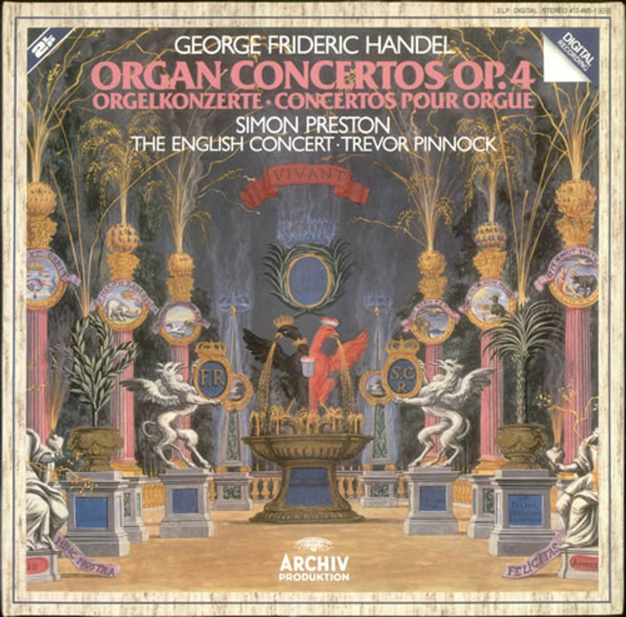 SIMON PRESTON with THE ENGLISH CONCERT conducted by TREVOR PINNOCK Handel: Organ Concertos Op. 4 (1984 German silver Archiv Produktion label stereo vinyl double LP, performed by Simon Preston and Ursula Holliger with the English Concert conducted by Trevor Pinnock, gatefold picture sleeve with extensive liner notes. The sleeve shows a little shelfwear whilst the vinyl appears barely played)