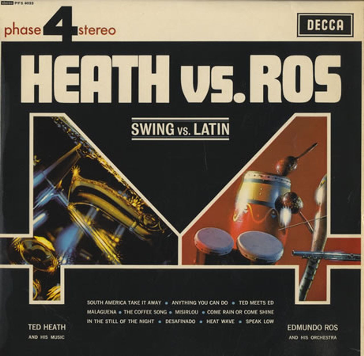 TED HEATH & EDMUNDO ROS Heath Vs. Ros (1964 UK 11-track Phase 4 Stereo LP, featuring the combined might of the Ted Heath & Edmundo Ros Orchestras playing a selection of Swing & Latin melodies in unison! front laminated sleeve with catalogue insert. The sleeve shows minimal wear & the vinyl looks barely played PFS4033)