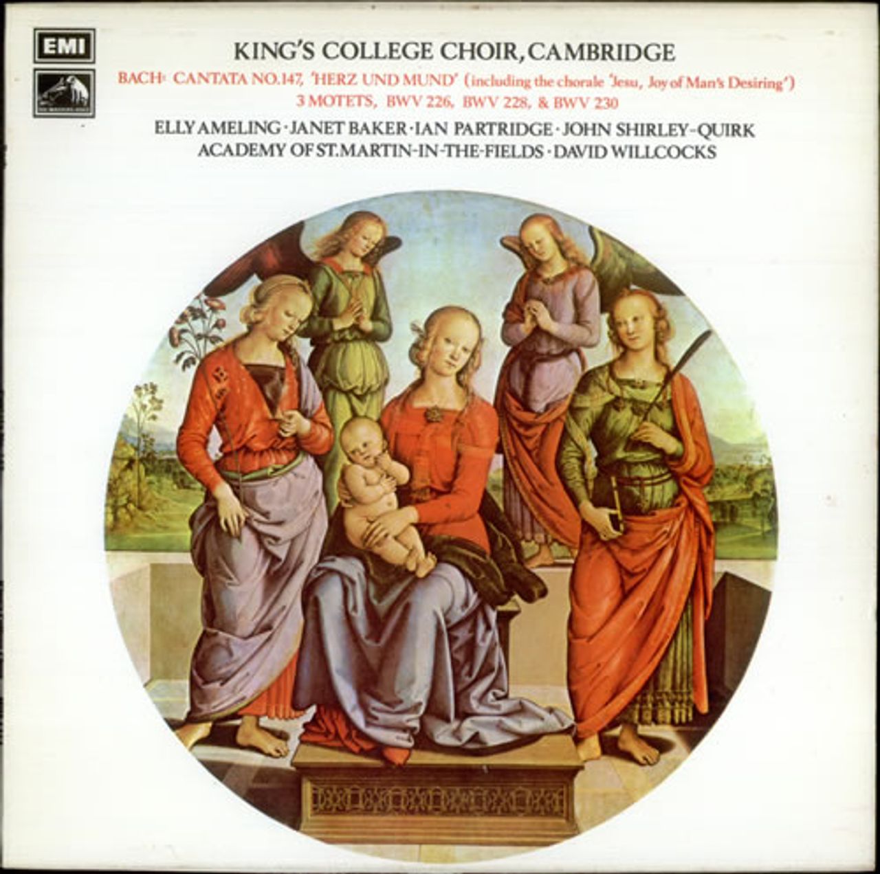 BACH Cantata No. 147, "Herz Und Mund"/ 3 Motets (1972 UK maroon HMV stamp label stereo LP, performed by Elly Ameling, Janet Baker, Ian Partridge & John Shirley-Quirk with the Academy of St. Martin-In-The-Field, as conducted by David Willcocks,front laminated flipback picture sleeve. The sleeve shows light wear & the vinyl appears barely played HQS1254)