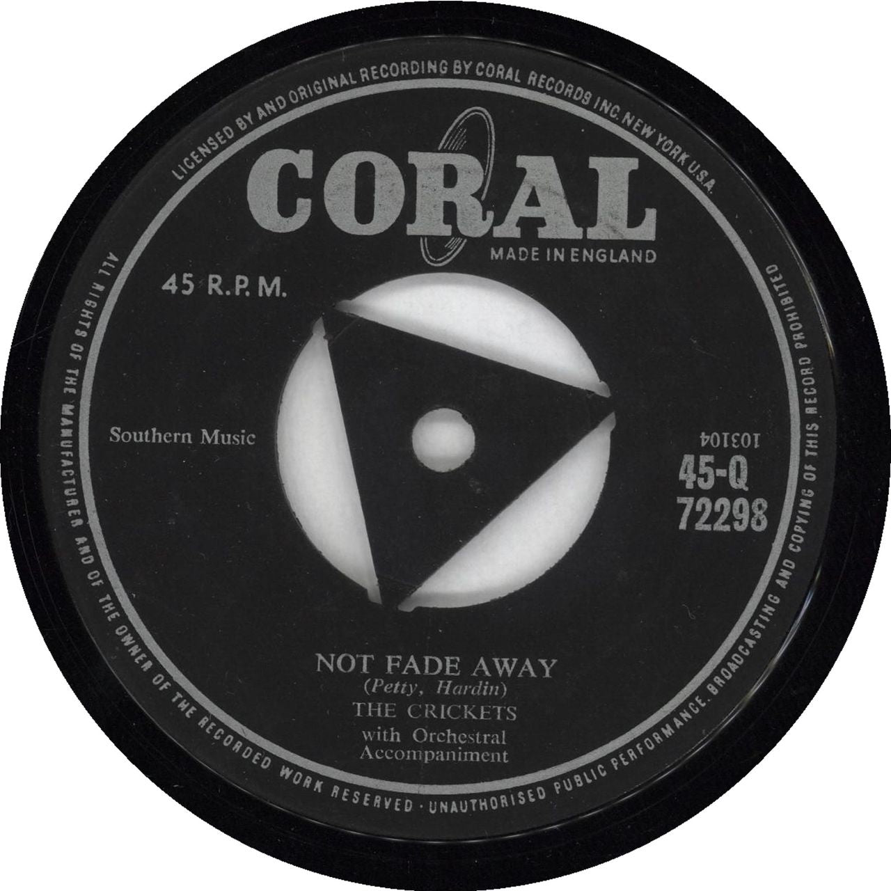 THE CRICKETS Oh, Boy (1957 UK first press 7" single featuring Buddy Holly, with intact triangular centre, also featuring the classic Not Fade Away, plain Coral company die-cut paper sleeve. The vinyl remains in VG+/EX- condition with just light surface scuffs to show for over sixty years 45-Q72298)