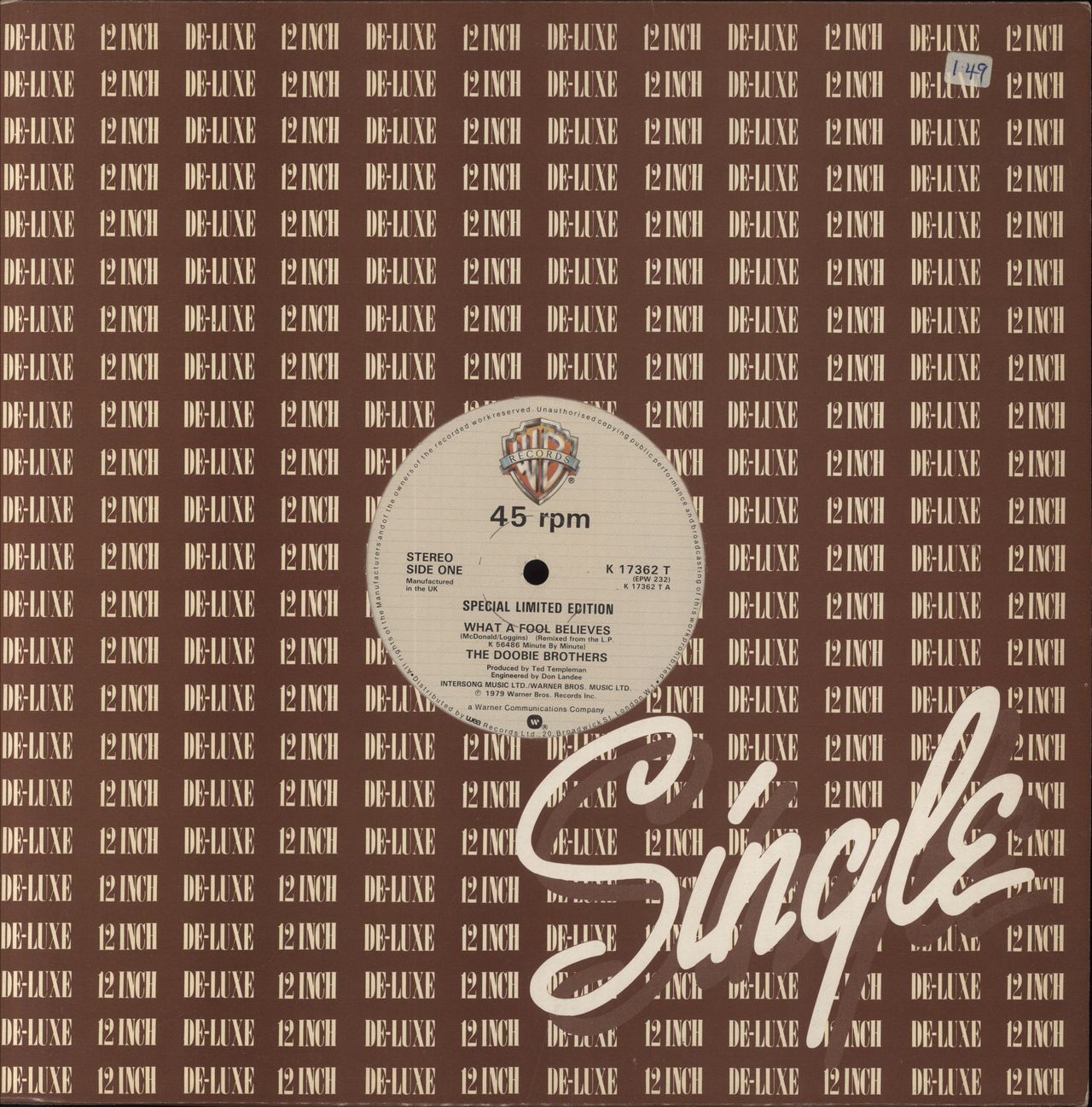 THE DOOBIE BROTHERS What A Fool Believes (1979 UK limited edition 3-track 12" single, a West Coast blue eyed disco masterpiece, produced by Ted Templeman. Also includes Don't StopTo Watch The Wheels & It Keeps You Runnin'. Housed in a Warner company die-cut sleeve, the vinyl remains in Excellent condition K17362T)