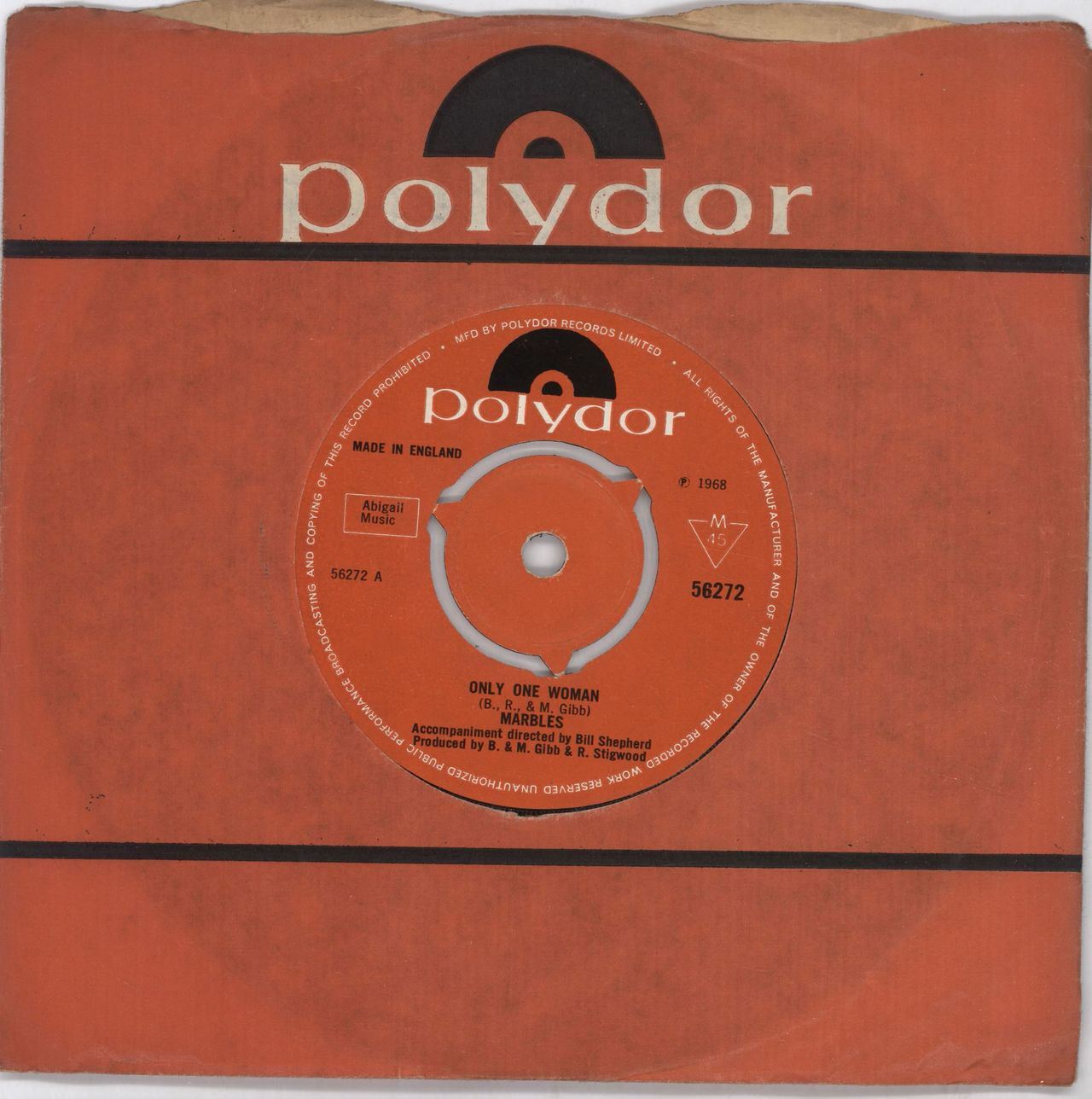MARBLES Only One Woman (1968 UK 7" vinyl single with intact three prong centre, featuring Graham Bonnet, also including By The Light Of A Burning Candle, with both tracks written and produced by the Bee Gees, Polydor company die-cut paper sleeve)