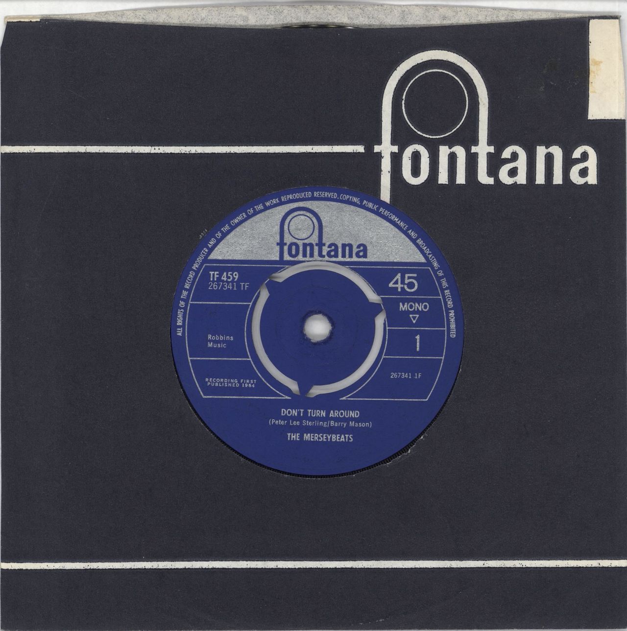 MERSEYBEATS Don't Turn Around (1964 UK 7" vinyl single with intact three prong centre, also including Really Mystified, Fontana company die-cut paper sleeve TF459)