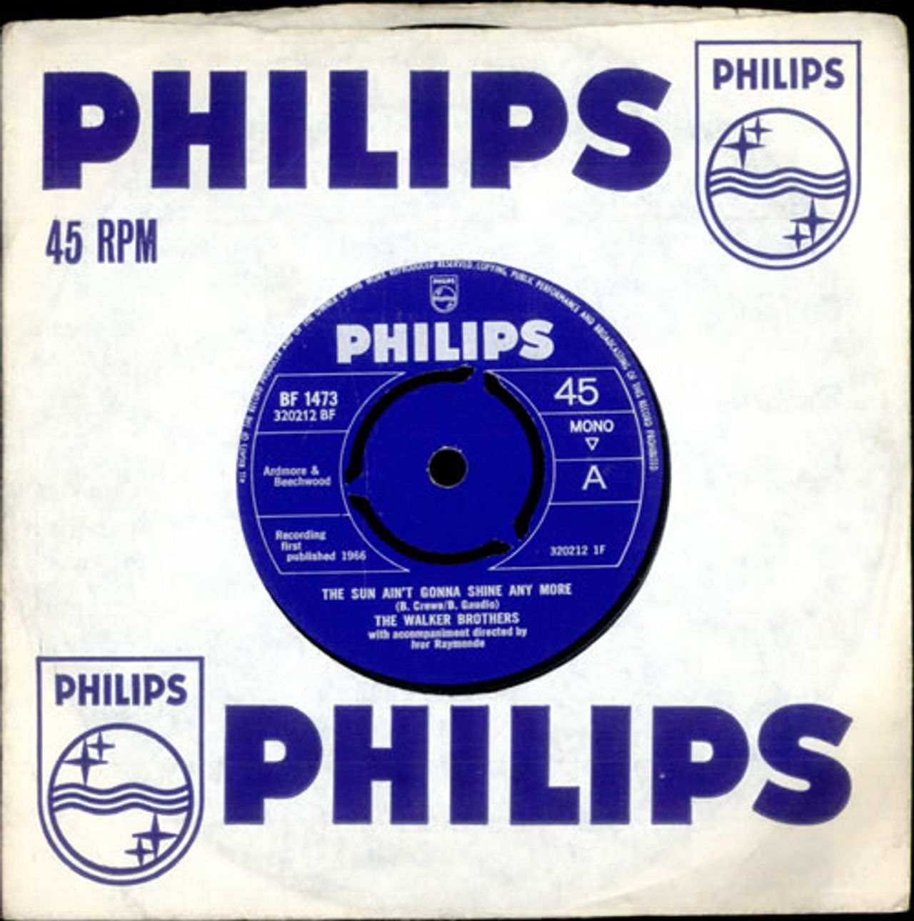 THE WALKER BROTHERS The Sun Ain't Gonna Shine Any More (Classic 1966 UK 7" vinyl single with intact original three prong centre, also including After The Lights Go Out, Philips company die-cut paper sleeve BF1473)