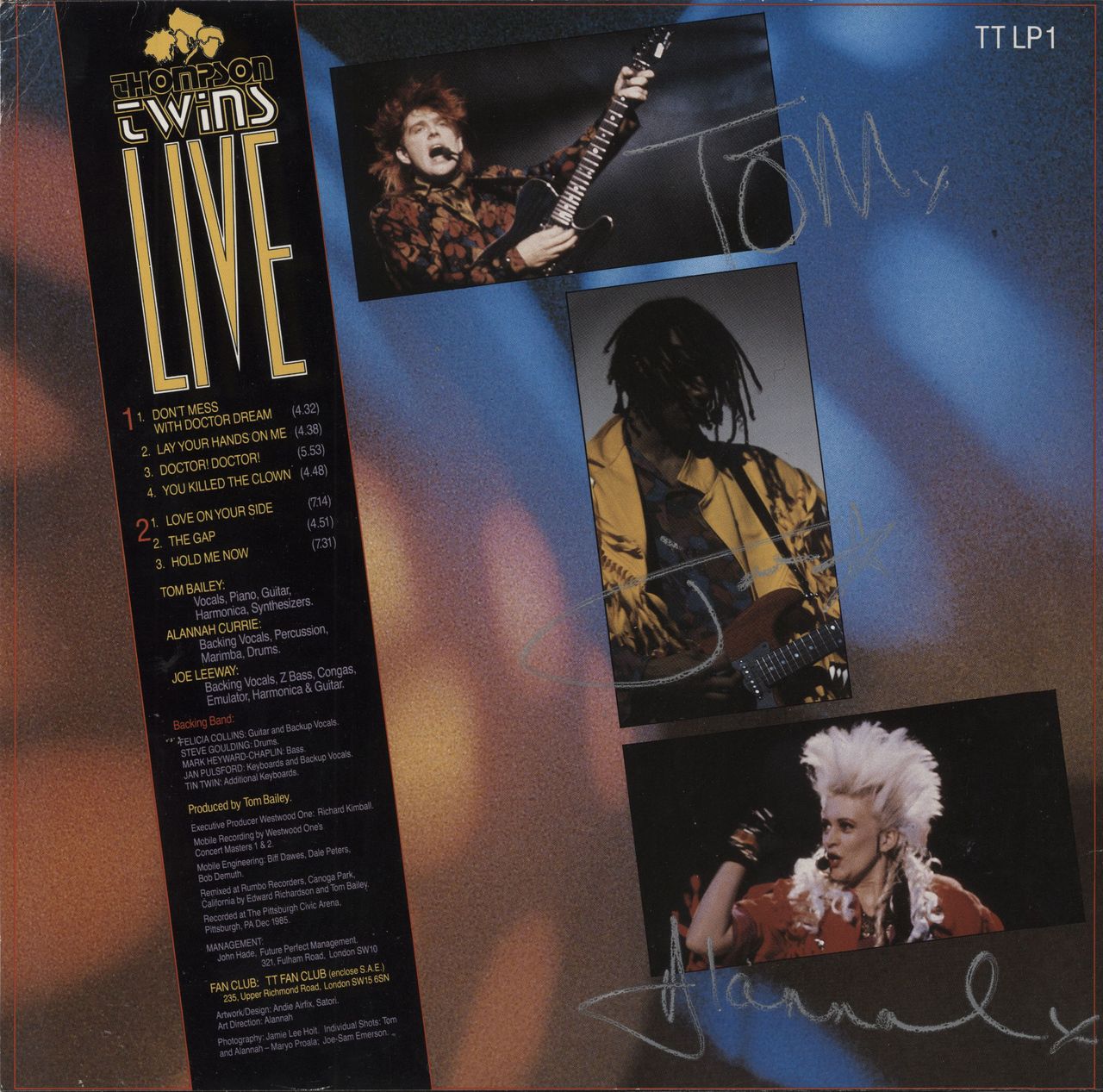THOMPSON TWINS Live (Stunning 1986 UK limited edition fan-club only 7-track vinyl LP, issued due to the cancelled tour in 1985. Housed in a great picture sleeve which has been FULLY AUTOGRAPHED by Tom, Alannah and Joe in silver marker pen on the reverse. The sleeve has only light edgewear, but the autographs are still clear and bright TTLP1)