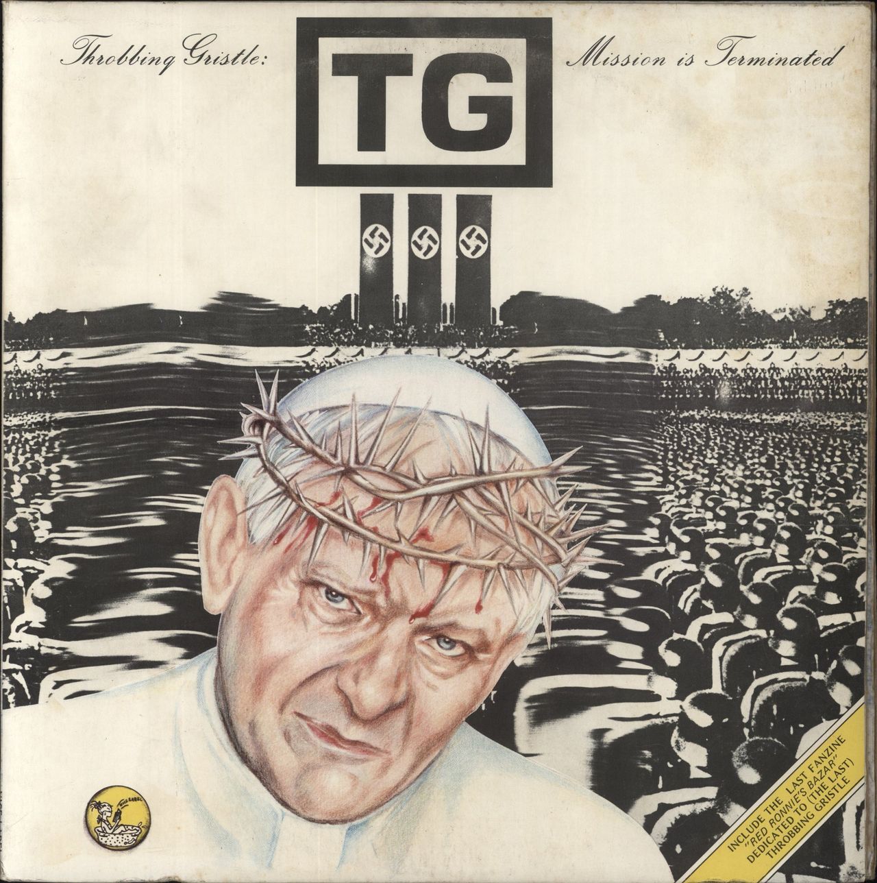 THROBBING GRISTLE Mission Is Terminated + Nice Tracks LP (1983 Italian 4-track vinyl EP with bonus 42-track compilation LP containing songs and cut-up spoken word excerpts from various artists. Housed in a gatefold picture sleeve. The sleeve shows some light general shelfwear but nothing overly excessive leaving it excellent. The vinyl has some minor cosmetic clouding though this has no real impact on play EX39LY2)