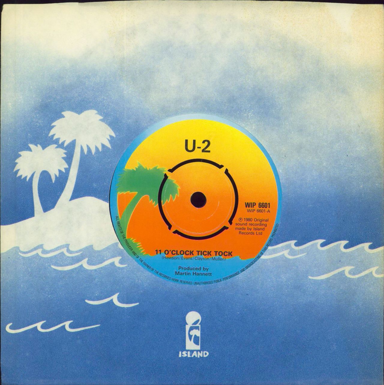 U2 11 O'Clock Tick Tock (1980 UK 7" vinyl single with intact four prong centre, also including Touch, Island company die-cut paper sleeve WIP6601)