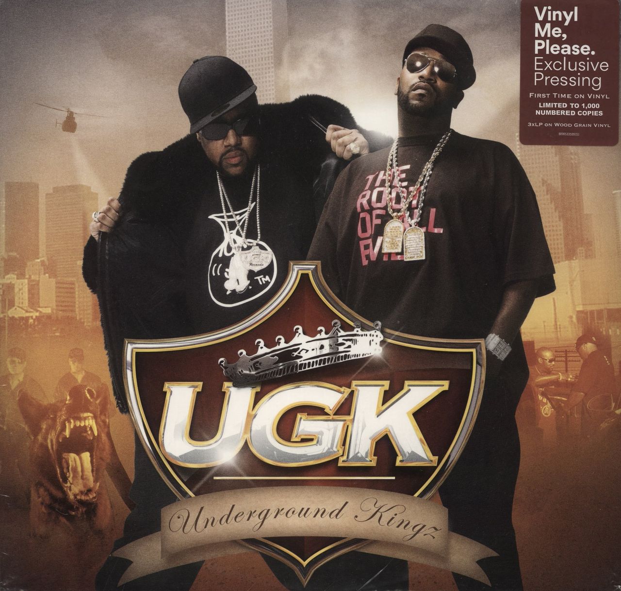 UGK Underground Kingz (2017 US 29-track vinyl 3-LP set, Vinyl Me Please exclusive pressing of the 2007 critically acclaimed release from the Texas hip-hop duo featuring the iconic Pimp C and Bun B. The fourth UGK album and final one released in Pimp C's lifetime, featuring the singles 'Internation Players Anthem [I Choose You]' and 'The Game Belongs To Me'. Pressed on brown [Wood Grain] coloured vinyl and limited to 1,000 copies only. Housed in a numbered, tri-fold picture sleeve with 16-page booklet. Comes in the original resealable, outer-bag with the hype-sticker affixed to the front. The sleeve shows very little signs of wear and the three vinyl discs remains in stunning Near Mint condition. Highly recommended, comes with three bonus tracks including a 'Copped & Screwed' remix of Int'l Players Anthem)