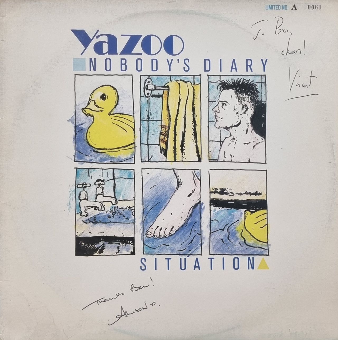 YAZOO Nobody's Diary (Autographed 1983 UK limited edition 12" vinyl single, featuring the Original 7" Mix & a re-recorded version of Situation, housed in an individually numbered picture sleeve. The cover displays some light general wear, and the vinyl has little signs of play. This copy has been signed and dedicated to Ben by both Vincent & Alison, their actual names instead of their alternate/abbreviated names, on the front in a black pen)