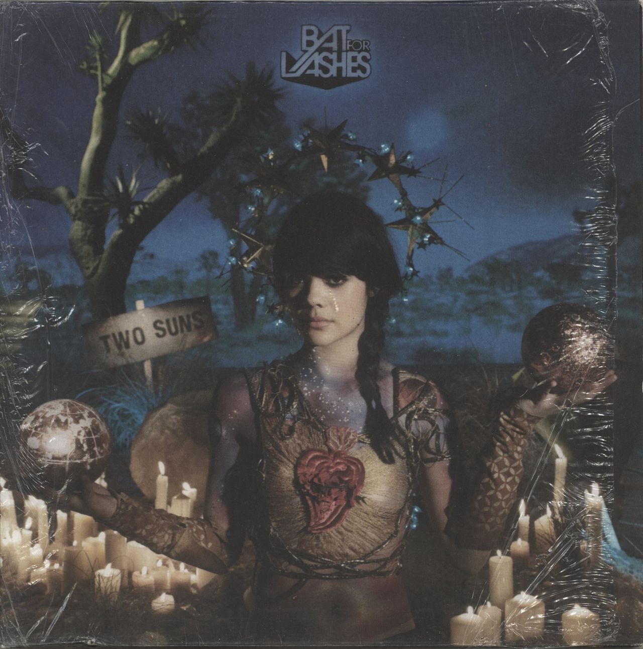 BAT FOR LASHES Two Suns (Autographed 2009 UK 11-track vinyl LP featuring guest appearances by Yeasayer on a number of tracks and a duet with the legendary Scott Walker on the closing song 'The Big Sleep', gatefold picture sleeve with lyric inner. This copy has been autographed on the inner by Natasha and dedicated 'To Keith with love! all the best Natasha XX'. The sleeve is in its opened shrinkwrap with just light wear and the vinyl has a little cosmetic wear due to storage with noreal impace on play leaving it Excellent. A great collectable!)