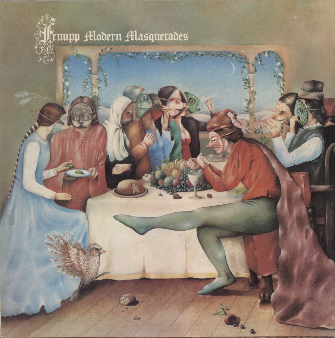 FRUUPP Modern Masquerades (Rare 1975 UK 7-track LP on Pye's Dawn imprint, pressed on Translucent Red Vinyl, visible when held to the light. The fourth & final studio album from the Irish progressive rock band, ina single pocket picture sleeve featuring great artwork by Robert Howe, with the rare fold-out lyric insert. The sleeve displays some mild shelf/agewear with a small sticker removal mark to the top right corner whilst the vinyl carries light signs of previous play. A fine example of this collectable progressive gem DNLS3070)