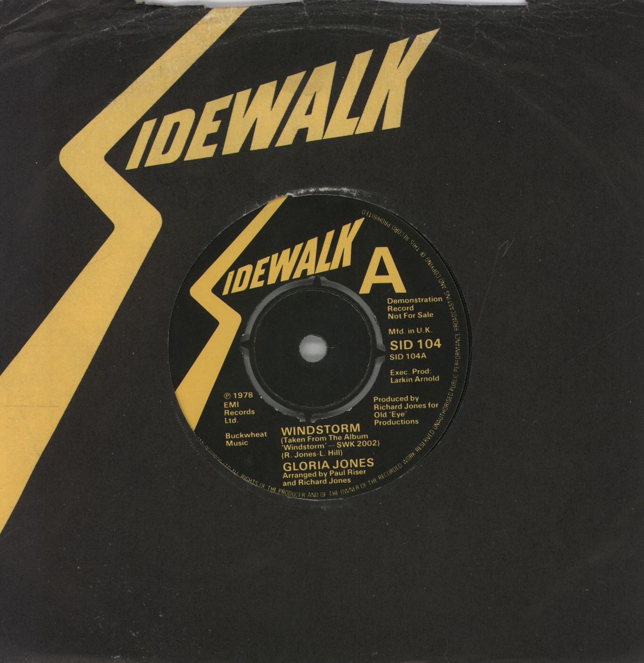 GLORIA JONES Windstorm (1978 UK demostration 'A' label vinyl 7" for the single release with four-prong centre, includes Blue Light Microphone, Sidewalk company die-cut sleeve SID104)