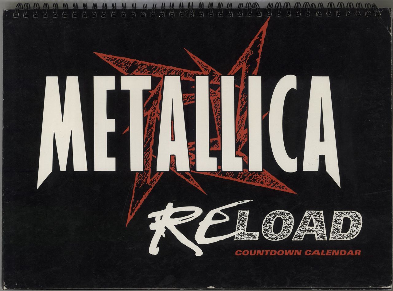 METALLICA Reload Countdown Calendar (Rare Official 1997 US Elektra label promotional only spiral bound custom calendar, produced to be displayed on record store counters with a count down of the last 30 days before the album release. Each pageas thealbum name logo with the heavy card cover also including the ninja star logo and artist name. This has a few signs of age with some light scuffing on the cover, still intact with immaculate pages inside)