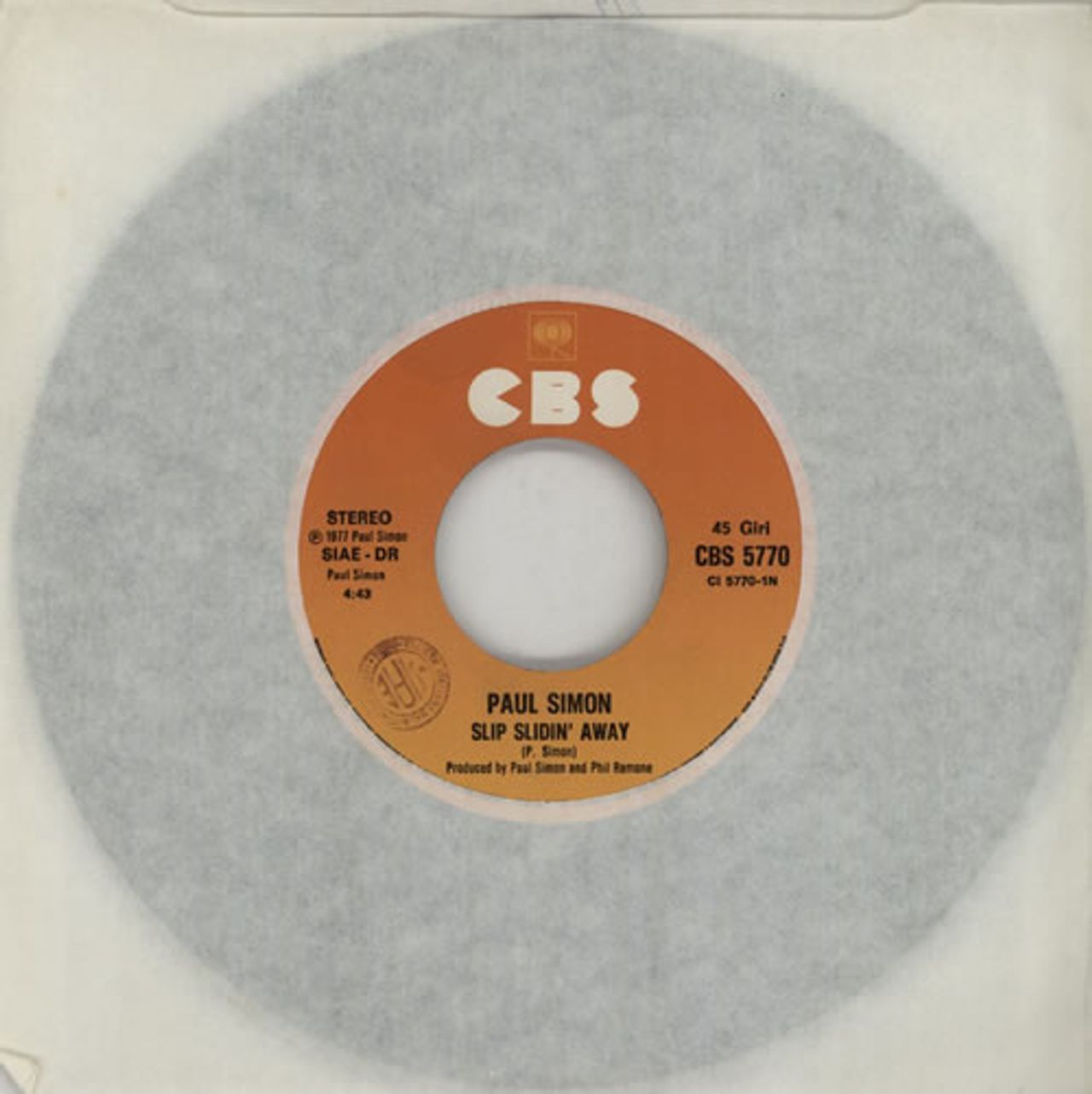 PAUL SIMON Slip Slidin' Away (1977 Italian wide centred 7" vinyl single, also including Something So Right, die cut paper sleeve CBS5770)