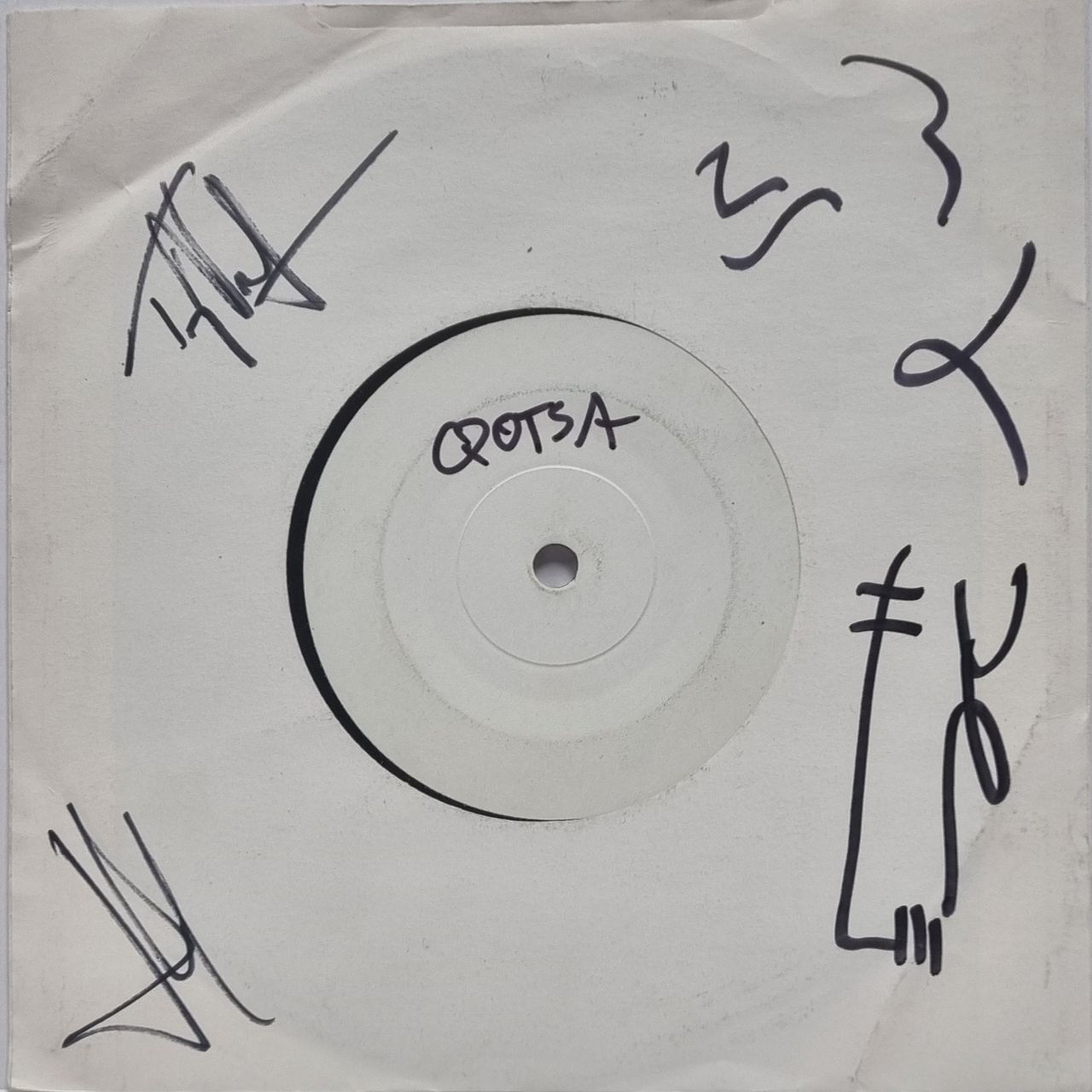 QUEENS OF THE STONE AGE The Fun Machine Took A Sh@t And Died! (Rare Autographed 2005 UK promotional white label vinyl 7", also including Commentary, housed in a plain die-cut paper sleeve which has been boldly signed by Josh Homme, Alain Johannes, Troy van leeuwan, Natasha schneider and Joey Castillo all in black pen. These were issued to UK fans who had tickets for a canceled show on the tour)