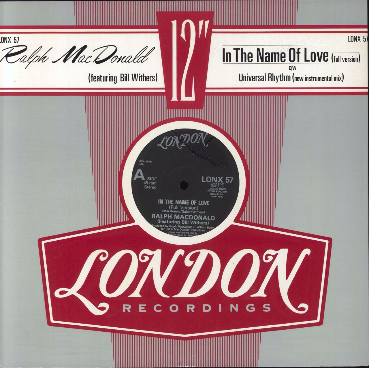 RALPH MACDONALD featuring BILL WITHERS In The Name Of Love (1984 UK 2-track 12" vinyl single, featuring the Full Version backed with Universal Rhythm [Instrumental Mix], die-cut title sleeve LONX57)