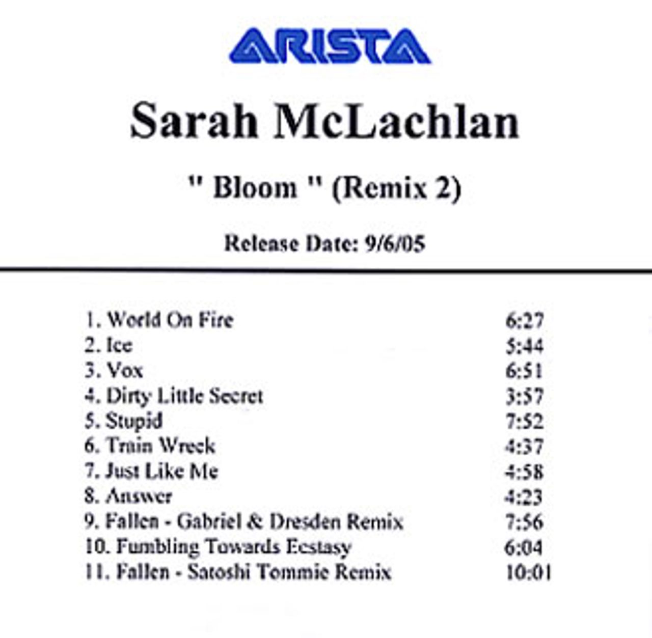 Sarah McLachlan Bloom - Remix 2 - 11-Track US CD-R acetate