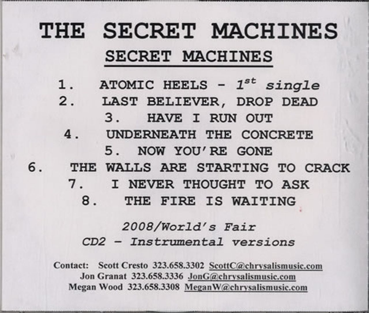 SECRET MACHINES Secret Machines (Official 2008 US Chrysalis label promotional only double CD-R acetate for the third album from alternative rock group, the first to featuring Phil Karnats after Benjamin Curtis left the band in 2007. The first disc features the full album including the single Atomic Heels, the second disc features instrumentals of the whole album. Custom printed disc complete with a custom title/tracklisting inlay)