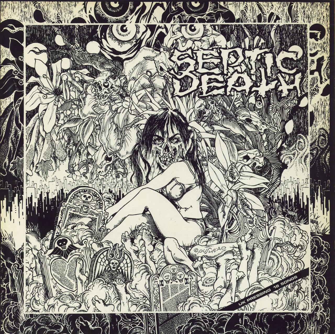 SEPTIC DEATH Now That I Have The Attention What Do I Do With It? (1986 UK 18 track vinyl LP with original black/greyish purple picture labels, picture sleeve with lyric inner. Septic Death was among the first hardcore bands in the United States.Their music was fast but also very technical. The lyrics of the band's songs mainly deal with fear, paranoia and mental states.This was the bands only full length release.The artwork was provided by the lead singer Brian "Pushead“ Schroederwho went on to design covers for Metallica among others. The sleeve has a little edge wear and light age fading and the vinyl shows a number of surface hairlines, which are purely cosmetic and have no impact on play. Essential Hardcore classic PUSMORT0012-01D)