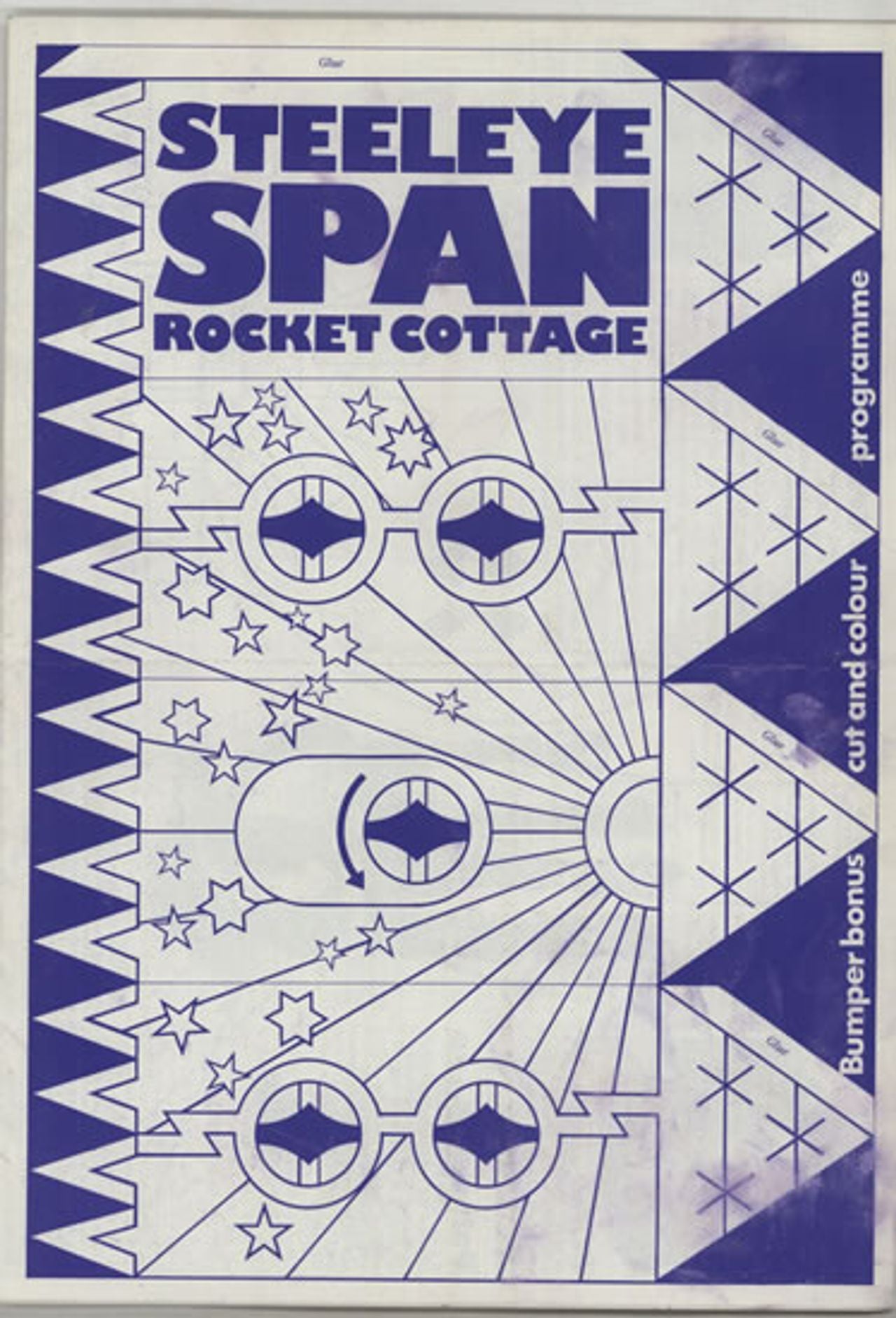 STEELEYE SPAN Rocket Cottage (Official 1976 UK fold out 'Bumper Bonus Cut And Colour' souvenir programme, featuring an inside devoted to Palmistry, Astrology, Phrenology, Dice divination & Numerology, along with comments from each of the members of the band, or you can cut out and throw a paper dart or a Rocket, if you'd prefer. The outside shows just a little light wear with the insides remainng pristine)