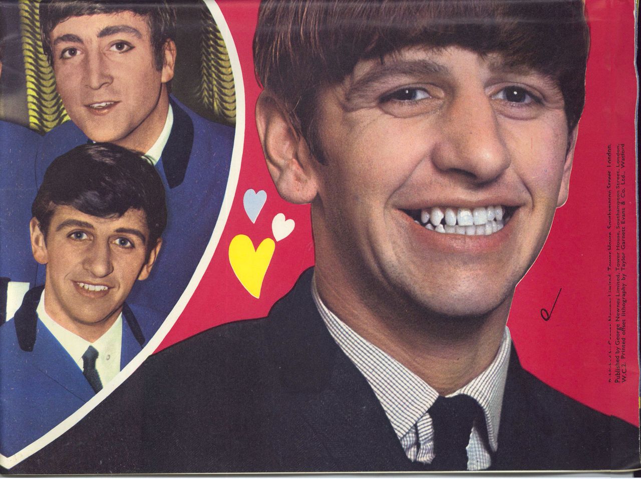 THE BEATLES All The Beatles (Early 1960s UK full colour 19" x 52" four-panel fold-out poster, featuring a head portrait of each member as well as four group shots. An interesting point is that this poster has a George-centric bias, as Georges head shot is in the centre and is also the largest, as well as being supplimented with another cut-out shot of him clutching his guitar, whilst John only merits one solo shot, which is also the smallest. If you hadn't heard of the band before youwould be under the impression that it was a three-piece led by George, with John employed as a hanger-on. The colours have a wonderful Sixties garishness about them, and age has not dimmed them, with the wonderful heart graphics reminding us of a time when The Beatles were a teenage heart-throb boy band. Still present and correct is the original plastic bag with orange 'Beatles' and 'Giant-size pin-up panel 2'6' text with no tears or holes. The poster appears never to have been displayed and shows a light fold along the middle due to its size, but no deep creasing. A nice momento from the early years of the group)