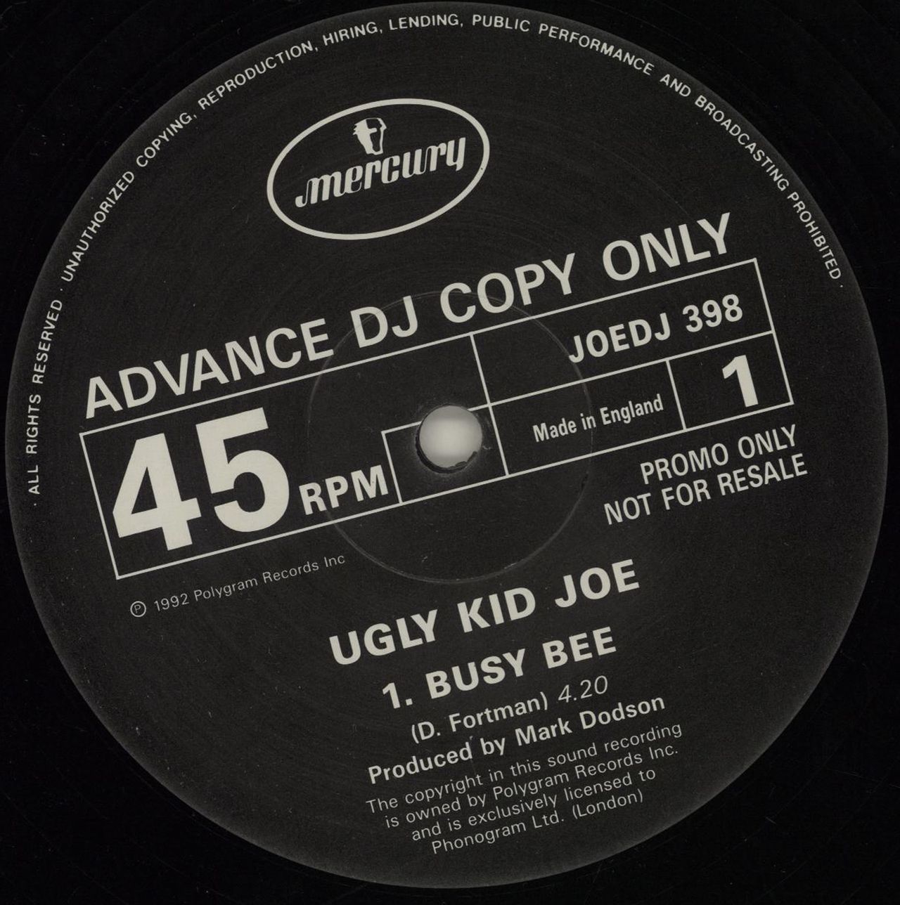 UGLY KID JOE Busy Bee (1992 UK 3-track 'Advance DJ Copy Only' promotional vinyl 12", also including Everything About You and Neighbour, promo & price stickered plain die-cut card sleeve JOEDJ398)